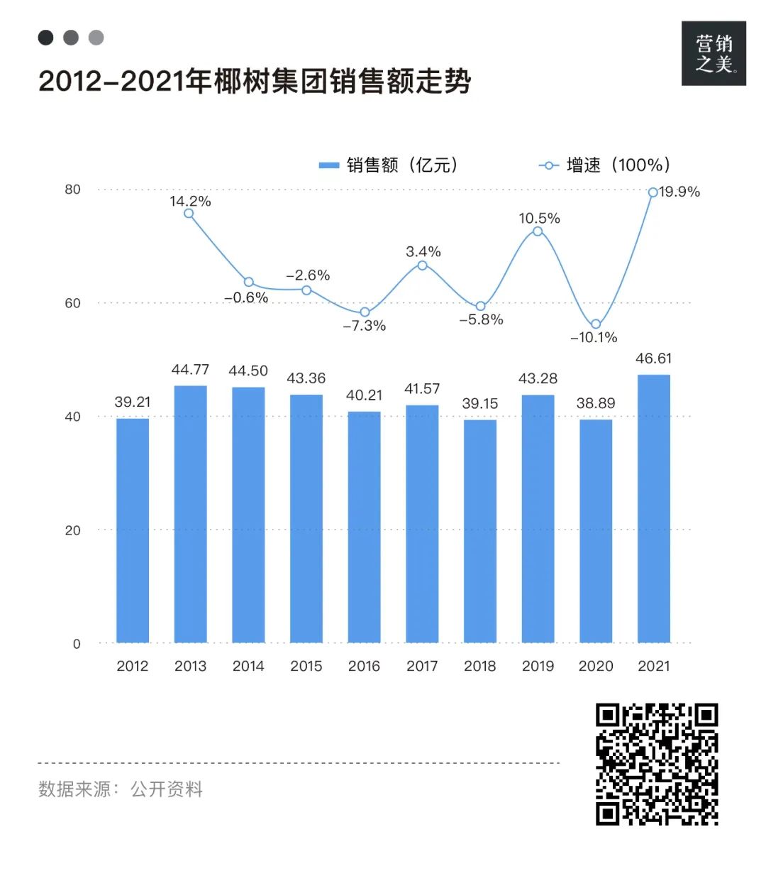 椰树集团的销售额多年来在四十亿上下浮动,增长已然见顶。除椰树牌椰汁外,其推出的天然矿泉水、果汁等均市场反响平平,鲜有知名度。椰树集团的业绩增长严重依赖椰树牌椰汁这一超级单品,产品创新乏力,很难找到第二增长点。据2019年统计数据,椰树椰汁仅占椰汁品类的26.32%,几乎不及十年前市占率的一半,这意味着椰树集团的业务“大腿”,也面临着外部竞争的压力。