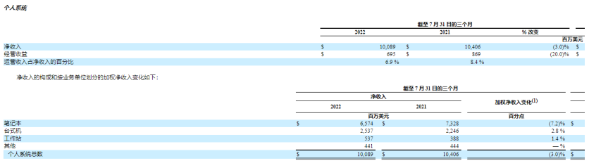 自2021年年中以来,消费型PC需求开始走弱,但商用PC需求一直保持坚挺。此前两个财季,惠普商用PC的增长一定程度上对冲了消费端的下滑。但从惠普第三财季数据来看,其商用部分营收增速仅为7%,较上一财季18%的营收增速出现了明显下滑。显然,全球经济的持续低迷也已经影响到商业电脑的需求,这也是惠普电脑销量滑坡的一个主要因素。