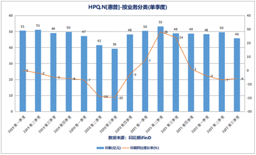 财报显示,第三财季惠普打印机部门实现营收46亿美元,同比下滑6%,环比下滑8%,不及分析师预期的48亿美元,这一数据也创下自2020年第四季度以来的最低纪录。