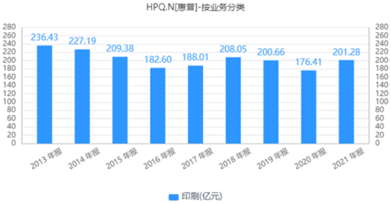 不过,自2018年以来,惠普打印机业务再次面临到增长乏力的困境,并多次陷入裁员风波。2019年-2021年,惠普打印机业务实现营收分别为200.66亿美元、176.41亿美元和201.28亿美元,均未超过2018年度的营收规模。