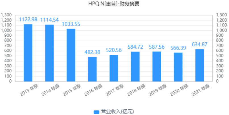 资料显示,拆分之后的惠普企业发展也不顺利。从营收数据上看,2021年惠普企业的总收入为277.8亿美元,收入规模仅相当于2016年同期(501.2亿美元)的55%。截至10月13日,惠普企业总市值为165亿美元。
