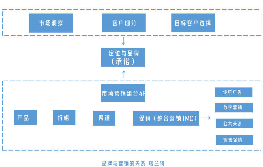 我们看这张图。我们通过市场洞察、客户细分和目标客户的选择,最终能够定位我们的品牌。然后通过产品、价格、渠道、促销这4P,来实现品牌的塑造。