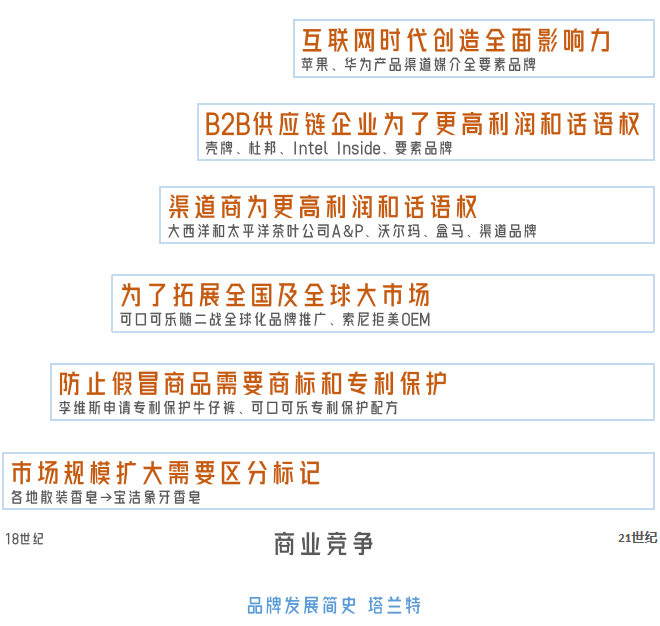 从品牌发展史可以看出,品牌的触点从外观形象、到法律保护,再到渠道与供应链,触点在不断地延伸。