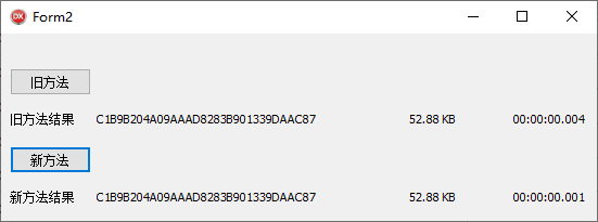 序言之前所说的获取文件MD5方法有性能问题,没多久我就遇到了,程序假死,卡顿。因此将获取文件MD5的方法改了一下,并测试了一下,大概性能提升了5倍,获取同一个文件的MD5,老方法用时是新方法的6倍。