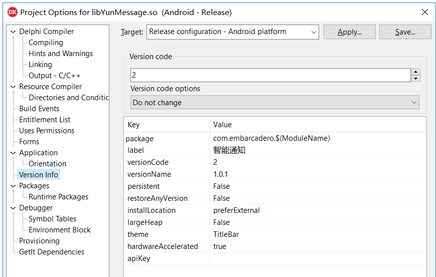 学习过程遇到的一些问题,记录下来,给遇到同样困惑的你...... 1.首先Delphi XE Andriod 下工程名中文是无法编译通过的.... 2.编译生成的APK文件是跟工程名称是一致的,默认安装好的程序名称也是跟工程名称也是一致的。 3.如需更改安装好的APP名称,按照如下设置即可。project-->option-->Versioninfo-->lable(默认改为自己APP名称)――――――――――――――――