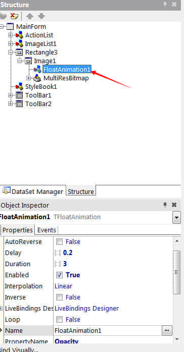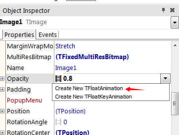 下面来看一下具体的做法:1.在Object Inspector中选择Image.Opacity属性,建立一个动画对象TFloatAnimation。注意,在控件属性值的左边有电影胶片的图标的,表示这个属性都可以设置成动画。Delphi <wbr>XE8 <wbr>为Image设置渐变效果2.在Stucture窗口中,多了一个FloatAnimation1对象,选择他,然后设置他的相关属性Delphi <wbr>XE8 <wbr>为Image设置渐变效果