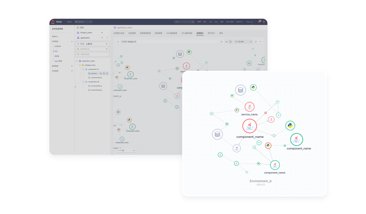 应用资源管理CMDB以应用为中心,实现多层级应用、子应用、组件到环境的模型管理,建立应用与云资源依赖关系。通过应用资源管理,可以找到应用与下级微服务以及部署在不同环境(开发环境、测试环境或生产环境等)下的资源实例,包括ECS、RDS、ELB、CCE等云服务实例,为应用监控、告警关联分析以及自动化运维提供配置数据。同时也支持通过开放配置数据接口,辅助第三方系统运维场景建设。