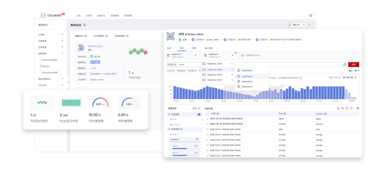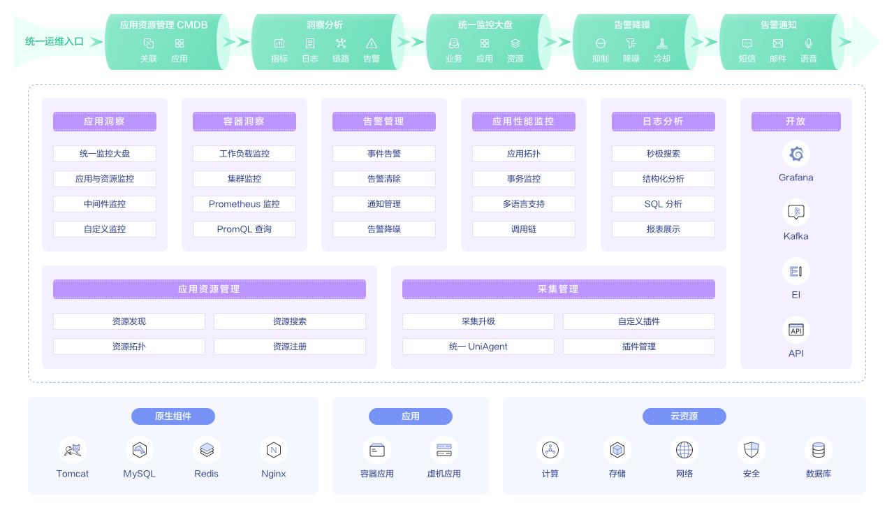 华为云应用运维管理平台将云监控服务(Cloud Eye,简称CES)的指标数据、云日志服务(Log Tank Service,简称LTS)的日志数据、应用性能管理服务(Application Performance Management,简称APM)的性能分析数据进行统一监控,从而提供了对云资源、应用和性能的全面监控和诊断。