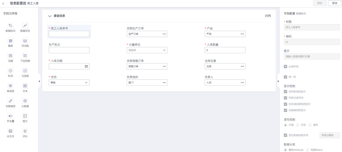 “完工入库单”的信息模型字段的配置方法,请参考上期介绍的信息配置器的使用方法,这里不再展开说明。