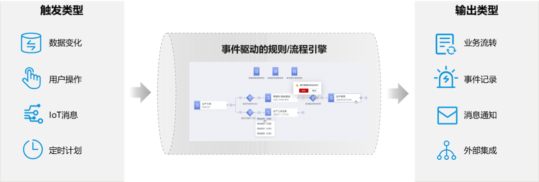 - 触发器:逻辑流引擎的触发源,支持以下四种触发器类型:数据变化(创建/变更)、用户操作、IoT消息和定期计划,能实时感知与响应业务数据/IoT设备数据的变化和用户的执行操作;
